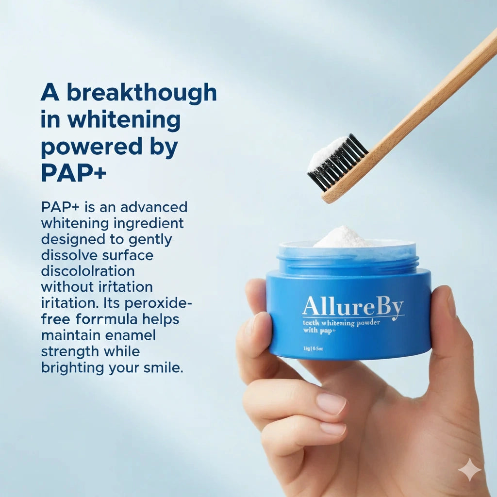 AllureBy Whitening Powder uses a dual-action formula. Gentle whitening actives help break down stains from coffee, tea, wine, and everyday life, while brightening pigments subtly neutralize yellow tones. The result is a smile that looks a little brighter right away – and keeps getting whiter with consistent use – all without harsh scrubbing or damaging your enamel.